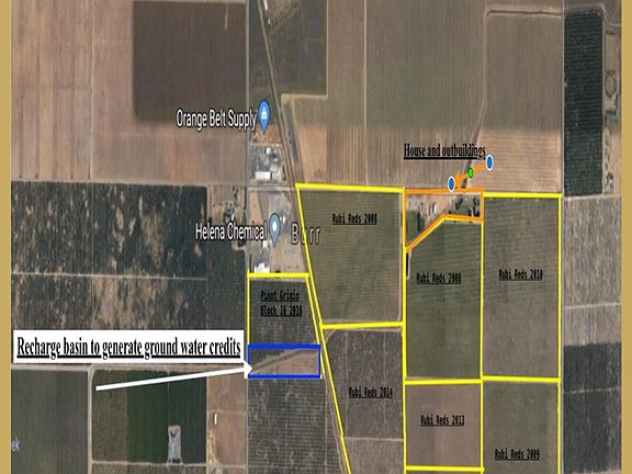 251 acres with 2 sources of water and railway frontage. Lewis Creek irrigation district is fed from the Friant Kern system. 40 Hp and 50 Hp agricultural wells and a domestic well. 461 ac ft of water entitlement from Lewis Creek ID. Metered sinking basin to collect ground water credits. 3 bd 1 ba farmhouse with corrals and outbuildings. Available meter if additional future sinking basin is desired. Currently planted in Rubi Red and Pinot Grigio wine grapes in contracts with E & J Gallo and CK Mondavi.