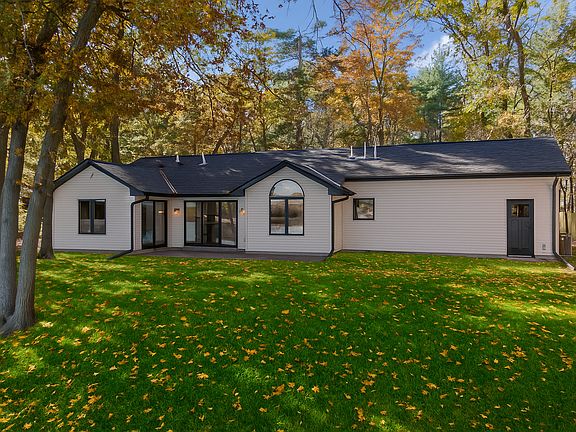 Enjoy the convenience of one-level living with panoramic lake views of protected state-owned land across the water, ensuring lasting tranquility. A three-panel sliding glass door in the living room brings the outdoors in, while the vaulted ceilings, ample natural light, and a cozy fireplace make the home feel warm and inviting year-round.