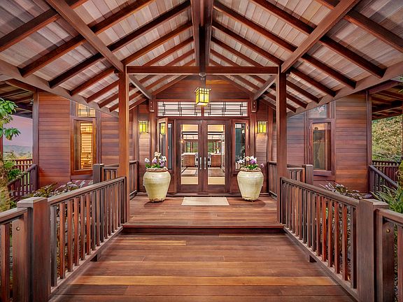 The expansive 1,200 square foot covered lanai with Ipe decking takes in the tremendous views, creating an idyllic setting for outdoor dining, entertaining, and relaxing. A gated entry leads to a meandering concrete driveway, ensuring tranquility, security and seclusion.