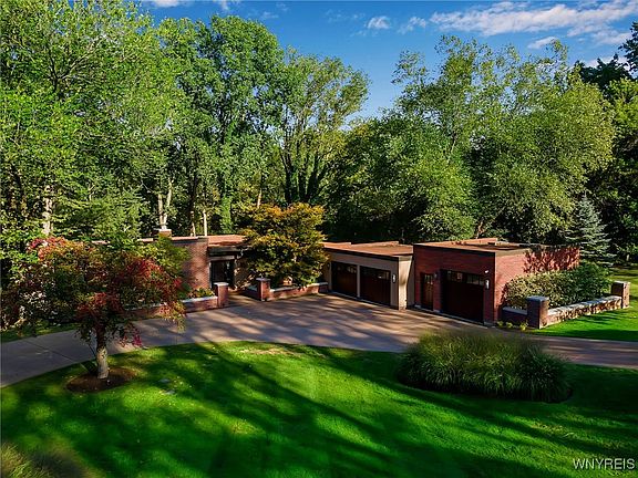 The Key To Your Luxury Dream Home is here at this One of a Kind Frank Lloyd Wright–Inspired Contemporary Hillside Ranch home on 2.9 Acres Along the Creek. Experience timeless design & modern luxury in this stunning 2-bed, 2-bath contemporary post & beam hillside ranch offering 2,394 sq. ft. of living space. Stunning curb appeal with U shape concrete driveway, professional landscaping surround, mature tree, 3 bay garage (heated/drains), exterior lighting, landscape lighting & tree lighting on a peaceful creek backdrop blending architectural sophistication w/ natural beauty. Walls of newly installed Marvin hurricane-rated windows and custom 10-ft wide slider doors create seamless indoor-outdoor flow & flood the home w/ natural light.Backyard oasis w/multi level patios, heated tile walkway, outdoor kitchen(fridge, sink, ice maker, lynx gas grill, green egg, hot tub, copper fire pit & gas lanterns. Upon Entering you'll notice the quality & craftsmanship throughout featuring an Open Concept floor plan w/architectural lines, comfortable in-floor heating throughout, LED lighting w/Lutron controls, solid Italian interior doors, gleaming pine ceilings, accent lighting & premium home speaker system.Custom solid cherry millwork enhances every space w/ warm, handcrafted detail. Chef's Dream kitchen is a showpiece, featuring top-of-the-line St. Charles cabinetry, Granite countertops, Sub-Zero refrigeration, Wolf steam oven & induction cooktop. Adjoining dining area includes custom built-ins, a bar w/ bev fridge, and an inviting layout perfect for entertaining.Two en-suite bedrooms designed for comfort & style on each floor. Primary suite 1'st Flr offers serene views, a spa-inspired full bath & Walk In California closet. Lower level 2'nd bedroom has a built in Murphy bed & built in office/desk area & attached full spa bath. Cozy & Comfortable Lower Level living room is an ideal setting for relaxing or hosting guests surrounded by nature. Convenient off garage mudroom, a spacious Lower level laundry room & storage available also. Do Not Miss this opportunity to see this unique home here in WNY. A Must See to Appreciate !