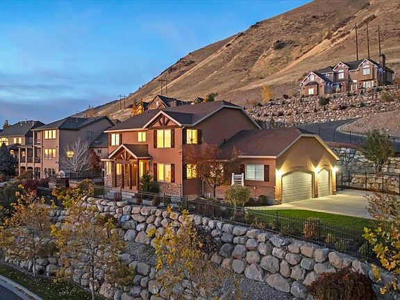Nestled in a quiet, upscale mountainside community, this stunning 6-bedroom, 5-bath home offers breathtaking views, elegant design, and modern comfort. The open-concept floor plan features vaulted ceilings, a floor-to-ceiling stone fireplace, and expansive windows that fill the living space with natural light. The gourmet kitchen includes premium cabinetry, stainless steel appliances, and ample counter space-perfect for everyday living and entertaining. The spacious primary suite provides a private retreat with spa-like finishes and serene hillside views. Enjoy outdoor living with multiple patios, landscaped terraces for gardening, and a private yard surrounded by stone retaining walls. Sellers are master gardeners and created a paradise of fruit trees, cascading grape vines, gardening boxes and more. The large three-car garage has insulated doors, epoxy flooring, and generous storage and parking. Located minutes from local schools, parks, and shopping, this home combines peaceful hillside living with convenient city access. Seller is including the movable shed, safe in basement, small fridge in pantry, TV's and mounts, 7.2 surround system and projector in the theater room, pool table, hot tub and Covana. All items are included "as is". Home has a radon mitigation system, google fiber up to 8 gig, wifi controlled sprinkler system, and Potassium water filtration system with Trojanuvmax water purification. New flooring, paint and dishwasher! Square footage figures are provided as a courtesy estimate only and were obtained from the Assessors . Buyer is advised to obtain an independent measurement.
