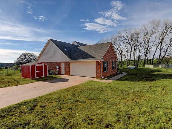 This stunning home rests on a beautiful 5 acres of land! The gorgeous living room boasts soaring vaulted ceilings, bright windows, and a fireplace and is open to the large kitchen. Featuring an island and breakfast bar, the kitchen also provides a pantry, granite counters, tile backsplash, stainless steel appliances, and double ovens. The master retreat offers a second fireplace, double vanities, walk in shower, and corner whirlpool tub. The spacious backyard includes an outdoor kitchen with a gas burner and sink. Home also includes: true study, storm shelter, multiple storage buildings, large unfinished upper level bonus room, and amazing views!