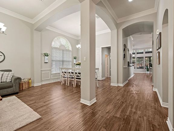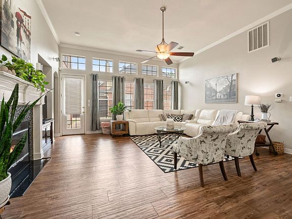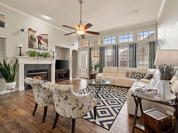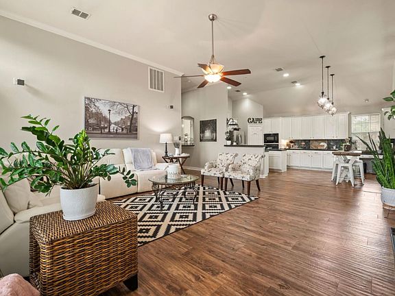 Cozy gas log fireplaceOpen flowing floor planPergola-covered patioCorner lotSpacious tree-lined corner lotHuge game roomDine-in island kitchen