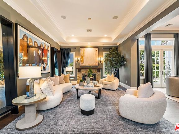 Welcome to this beautifully upgraded Classics Plan 3 home situated in The Oaks of Calabasas, one of Southern California's most prestigious guard gated communities. This exceptional two-story, 5BD/5.5BA estate combines timeless architecture with modern luxury, offering refined interiors, smart home upgrades, and panoramic views. Inside, warm hardwood floors, arched hallways, and custom details create an inviting atmosphere. Just off the entry, a sophisticated office with built-in cabinetry and expansive windows provides a serene space for work or study. The first ensuite bedroom is located downstairs, as well as a powder bath conveniently located near the entryway for guests. Down the hallway, the formal living room features an elegant fireplace, creating a cozy yet elevated setting. It flows seamlessly into the formal dining room, anchored by a statement chandelier and french doors extending the space to a charming outdoor seating area. At the heart of the home lies the expansive family room, distinguished by high ceilings, exposed wooden beams, and a second fireplace that adds rustic charm to the sophisticated design. This space opens directly to the gourmet kitchen, where a dramatic quartzite center island, high-end appliances, and abundant cabinetry create the ideal space for both everyday living and entertaining. A butler's pantry connects the dining room to the kitchen, enhancing both functionality and flow. Upstairs, a versatile bonus room awaits, adorned with barn doors and a drop-down movie screen, perfect for a media lounge or playroom. The primary suite is a true retreat, featuring a private balcony that captures the backyard and picturesque hills, a spacious bonus room ideal for a gym, nursery, or office, a walk-in closet, and a luxurious ensuite bath. The spa-inspired bathroom includes a freestanding soaking tub positioned to take in scenic views, dual vanities and an expansive steam shower. Three additional ensuite bedrooms offer ample closet space and privacy, while a dedicated laundry room on this level adds convenience. The resort-style backyard offers an infinity-edge pool and spa with fountains, lush landscaping, a built-in barbecue and fridge, outdoor speakers, and a dual fireplace creating multiple zones for lounging, dining, and entertaining, all set against a backdrop of breathtaking views. As a resident of The Oaks of Calabasas, you'll enjoy 24-hour gated security and proximity to nature trails, top-rated schools, and premier shopping and dining destinations. Welcome to a new standard of luxury living!