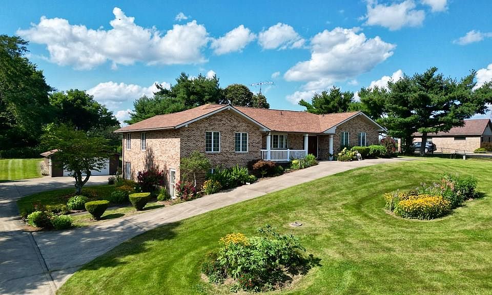 Large, quality built ,one owner home has beautiful views! Walk in to the large foyer with slate tile flooring, with views of the living, dining and eat in spacious kitchen as soon as you walk in. Very nice flow, perfect for hosting parties! There's 5 bedrooms and 4 baths, with full walkout basement with 2 car garage in basement as well. Kitchen has ceramic tile with carpet in peninsula island and eat in areas. Unique layout has Living room, Family room, one bedroom and one bath all up 2 steps from the kitchen, dining and other bedrooms, making multi generational living possible. Basement has one bedroom and full bath, huge open L-shaped walk out family room with bar (20.6x16.6 room not shown in the measurements). Additional 2 car detached garage, large deck, nice landscaping and property is fully fenced with chain link and a double gate at the driveway. There's an extra driveway to the front door. Most furnishings will be for sale.