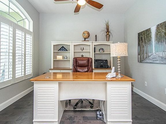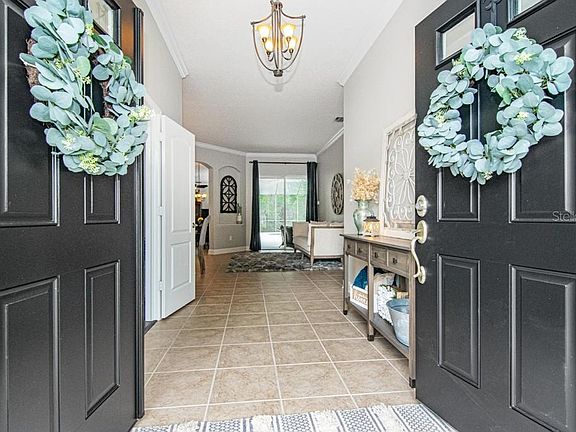 Desirable Lexington Oaks home situated on a cul-de-sac, bordered by conservation area in the back offers a 3 split floor plan, bonus room, 10 foot ceilings & multiple upgrades, giving this home sophistication & elegance. As you walk in the front doors, tile flooring flows through the entryway, continues to the combined dining & living room and then into the kitchen & family room. To the left at the front of the home is a stately office with hardwood flooring. To the right is the master suite with hardwood floors, newly remodeled ensuite bathroom & a sliding door leading out to the pool. Past the entryway is a large, open dining room & living room. The hub of the home is the kitchen with stylish white cabinets, a large center island, and a breakfast bar overlooking the family room. A sliding door in the living room & 3 additional sliding doors in the kitchen area & family room all lead out to the screened pool & spa. The fourth bedroom is a large second master suite with private bathroom and is located at the back of the house with a door leading from the bathroom to the pool area. A bonus room is located upstairs with a a half bath. A large laundry room & sizable storage closet make this home even more desirable. NEW CARPET in 3 bedrooms & bonus room, 5 inch baseboards, crown molding, and NEW ROOF 2019. Community provides swimming pool, tennis courts, fitness center, playground, basketball courts and clubhouse.