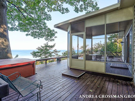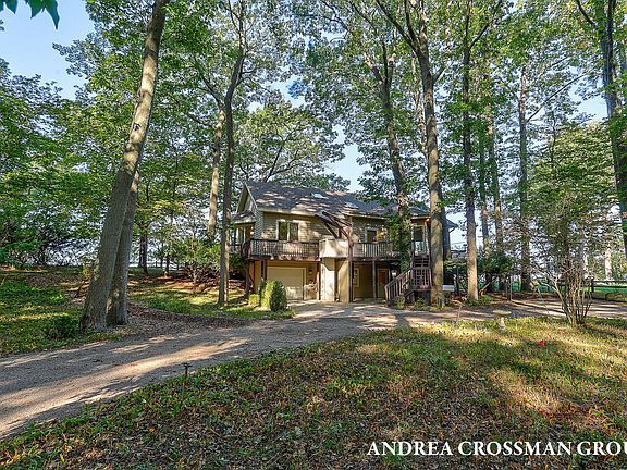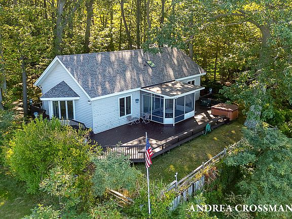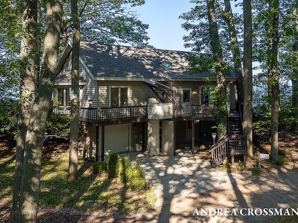 Lake Michigan beach home on a deep wooded lot with guest house and beautiful views. Situated on a lower bluff with sandy beach and protected dune along a quiet stretch of Lakeshore Dr between Saugatuck and South Haven, just north of the M89 exit in Fennville. This area is beautiful, calming, and offers an escape from the hustle and bustle of the city. Rebuilt in 2003, the home features a main floor primary suite, open living/dining/kitchen with screened porch and lakeside deck. The lower level includes 2 bedrooms, full bath, and family room. An outdoor chair lift (or grocery lift) makes accessing the elevated main level convenient and accessible. The guest suite sits above a second garage with workshop, with potential to expand for more garage or living space. A charming 1-bedroom, 1-bath guest apartment completes the space. This quintessential Lake Michigan cottage also offers ample parking and a beautiful circular driveway,