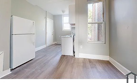 This property offers a refreshed and bright living space, featuring recent upgrades like contemporary light gray paint throughout and attractive, easy to maintain wood look flooring. The kitchen boasts a modern, all white aesthetic with updated cabinetry and appliances, including a range and full sized refrigerator, set beneath a bright window. The living area is versatile, shown to comfortably accommodate a dining set for a cozy eat in kitchen space. Bedrooms are well lit with large windows and include convenient closet storage, such as the double door closet shown. The unit also features modern baseboard heating and a clean, tiled bathroom with a tub/shower combination. Overall, the apartment presents a clean, modern, and move in ready environment.