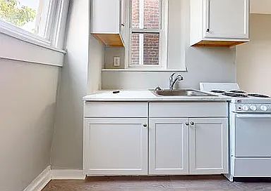 This property offers a refreshed and bright living space, featuring recent upgrades like contemporary light gray paint throughout and attractive, easy to maintain wood look flooring. The kitchen boasts a modern, all white aesthetic with updated cabinetry and appliances, including a range and full sized refrigerator, set beneath a bright window. The living area is versatile, shown to comfortably accommodate a dining set for a cozy eat in kitchen space. Bedrooms are well lit with large windows and include convenient closet storage, such as the double door closet shown. The unit also features modern baseboard heating and a clean, tiled bathroom with a tub/shower combination. Overall, the apartment presents a clean, modern, and move in ready environment.