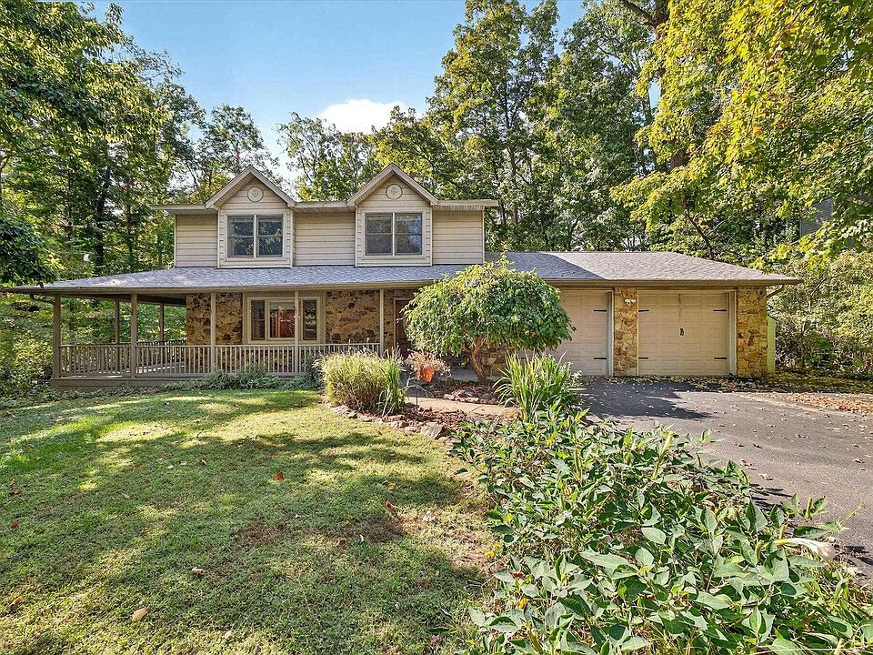 Beautiful home nestled among mature trees, offering the perfect blend of privacy, warmth, and functionality. A stone-accented exterior and inviting wrap-around porch create a welcoming first impression, while multiple decks and a screened-in porch provide serene views of the wooded surroundings. Step inside to a bright, open layout featuring hardwood and slate floors that flow through the main living areas. The spacious family room centers around a stunning stone fireplace, and the updated kitchen offers wood cabinetry, stainless-steel appliances, a center island, and pendant lighting. Arched doorways lead to the dining area and foyer, creating a natural sense of connection and space. Upstairs, the primary suite offers a spa-like retreat with a jetted soaking tub, walk-in shower, and dual-sink vanity, along with a convenient laundry area. Two additional bedrooms feature large windows and generous closet space. The finished walkout basement adds flexible living space with a kitchenette, full bath, and two additional rooms—perfect for guests, hobbies, or a home office. Outdoor living shines here with a large screened porch featuring vaulted ceilings and wood detailing, multiple decks with built-in seating, and a hot tub surrounded by nature. A two-car attached garage with built-in storage completes this inviting property that beautifully combines comfort, versatility, and wooded tranquility.