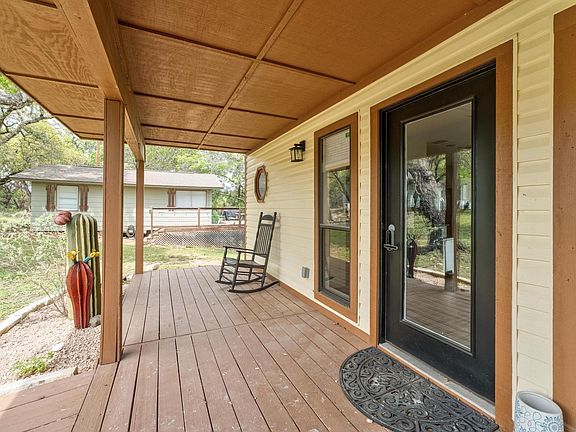 Nestled in a peaceful riverside community, this inviting 3-bedroom, 2-bath lakehouse blends modern comfort with Hill Country charm. Surrounded by mature trees and natural beauty, the home welcomes you with a classic front porch and a warm, thoughtfully updated interior featuring tile plank floors, abundant natural light, and an open layout perfect for entertaining or quiet evenings in. The kitchen is a standout with sleek open shelving, granite countertops, stainless appliances, and a functional island. The spacious primary suite offers treetop views through panoramic windows and a spa-inspired ensuite complete with a soaking tub, dual vanities, and a large walk-in shower. Two additional bedrooms provide flexible space for guests or family. Step out back onto the covered deck—ideal for grilling, relaxing, or simply enjoying the peaceful views of the gently sloping yard that backs to a seasonal riverfront. Whether you’re looking for a weekend retreat, full-time residence, or short-term rental opportunity, this turnkey home on the Pedernales arm of Lake Travis delivers comfort, style, and a tranquil setting just minutes from boat ramps and local parks.