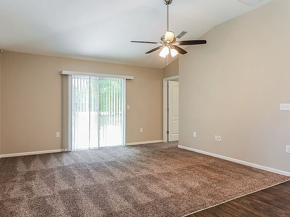 This move-in-ready rental home in Green Cove Springs, FL boasts three good-sized bedrooms, two bathrooms, a laundry room, and an attached garage. You'll love the home's open-plan layout, which includes soft carpeting and an extra-high ceiling in the living room. Sliding glass doors offer lots of natural light as well as a pleasant backyard view. Steps away in the modern kitchen, home cooks will make good use of the stainless steel appliances and the double-basin sink. Spread out over the center island as you prepare your meals. The main bedroom suite at the rear of the home is a comfortable space with a lighted ceiling fan, a walk-in closet, and a private bathroom. Apply to tour this property in person today!