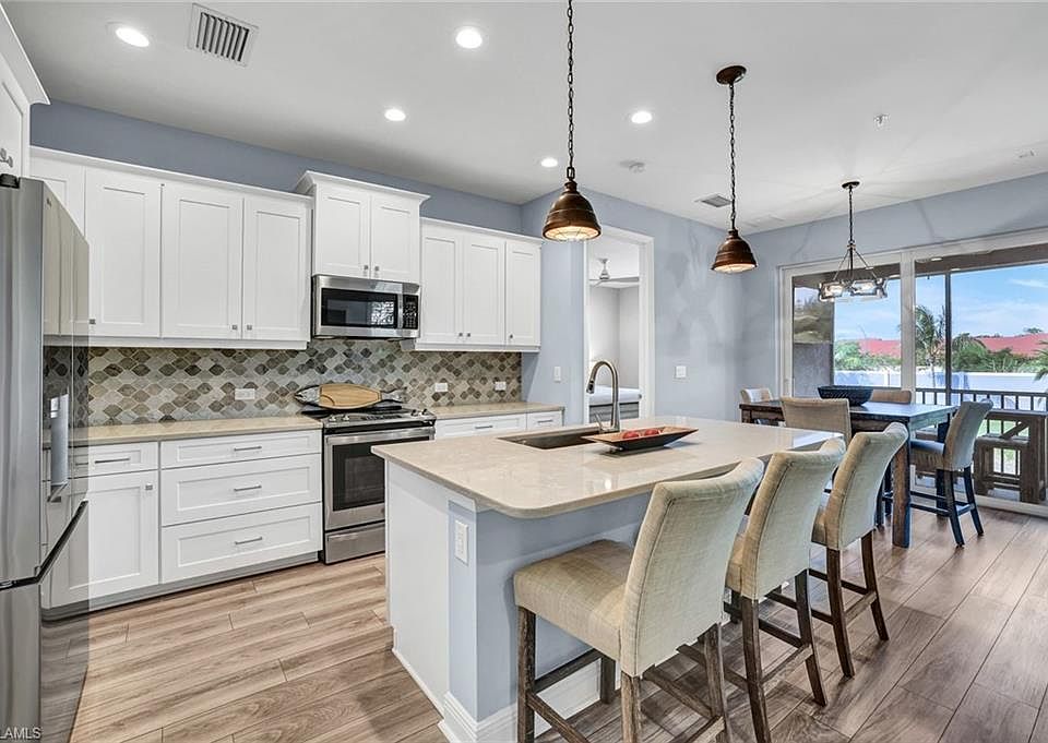 Lakeview and Western Exposure for Naples Sunsets! Seychelles built by Neal Communities with luxury British West Indies architecture. PARTIALLY FURNISHED! 2nd story carriage home located 5 minutes to downtown Naples/5th Avenue and the white sandy beaches of the Gulf. This light and airy open-concept Windemere floor plan unit is located in private cul-de-sac featuring 2 large bedrooms + Den (furnished) 2 full bathrooms and 1 car garage with long driveway for guests. Loaded with luxury upgrades, plantation shutters, including porcelain stone look flooring, chef's eat-in kitchen, dining room, white cabinets with soft close cabinetry, under mount lighting, designer backsplash, contemporary white quartz countertops, LG stainless refrigerator, appliances, and a center island. The spacious master bedroom and spa-like walk-in shower bath is elegantly appointed with double vanity, and has an oversized walk-in-closet, washer/dryer/laundry room. One of the most desirable features of this home is the lanai with TV overlooking the beautiful lakeview. Seychelles features amenities that included an oversized resort style heated pool and spa, fitness center featuring impact floors, Matrix equipment and free weights, fire pit, outdoor gas grill and clubhouse for social gatherings! Convenient location to downtown Naples, I-75 and airports.