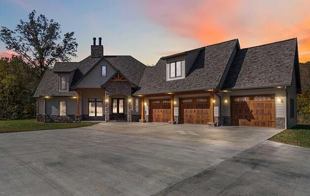 Discover modern craftsmanship and timeless beauty in this brand-new custom home set on 37 acres of serene Kentucky countryside. From the striking stone façade and timber accents to the three-car garage with wood-style doors, every detail has been thoughtfully designed. Step inside to find an open-concept layout filled with natural light, featuring vaulted ceilings with exposed beams, a grand floor-to-ceiling stone fireplace, and rich hardwood flooring throughout. The chef's kitchen is both functional and beautiful, showcasing granite countertops, custom cabinetry, a large center island, and premium fixtures. The primary suite provides a spa-like retreat with heated tile floors, dual vanities, and a luxurious walk-in tile shower. Upstairs, the bonus room offers extra versatility—perfect for a home office, guest suite, or hobby space. The home is designed for comfort and energy efficiency, featuring 16-SEER systems for the first and second floors and an 18-SEER system for the bonus room, ensuring year-round climate control while keeping energy costs low. The walkout basement adds even more living space, complete with a second stone fireplace and open recreation area ready for a bar, gym, or home theater. Step outside to the covered back deck or lower patio and enjoy panoramic views of your 37 private acres — ideal for trails, wildlife watching, hunting or simply enjoying the peaceful outdoors.