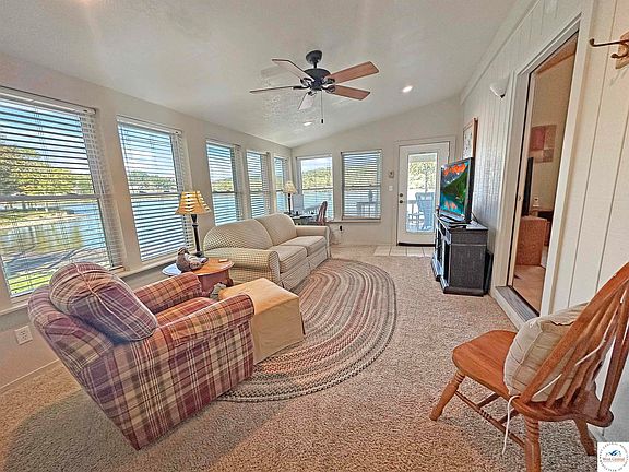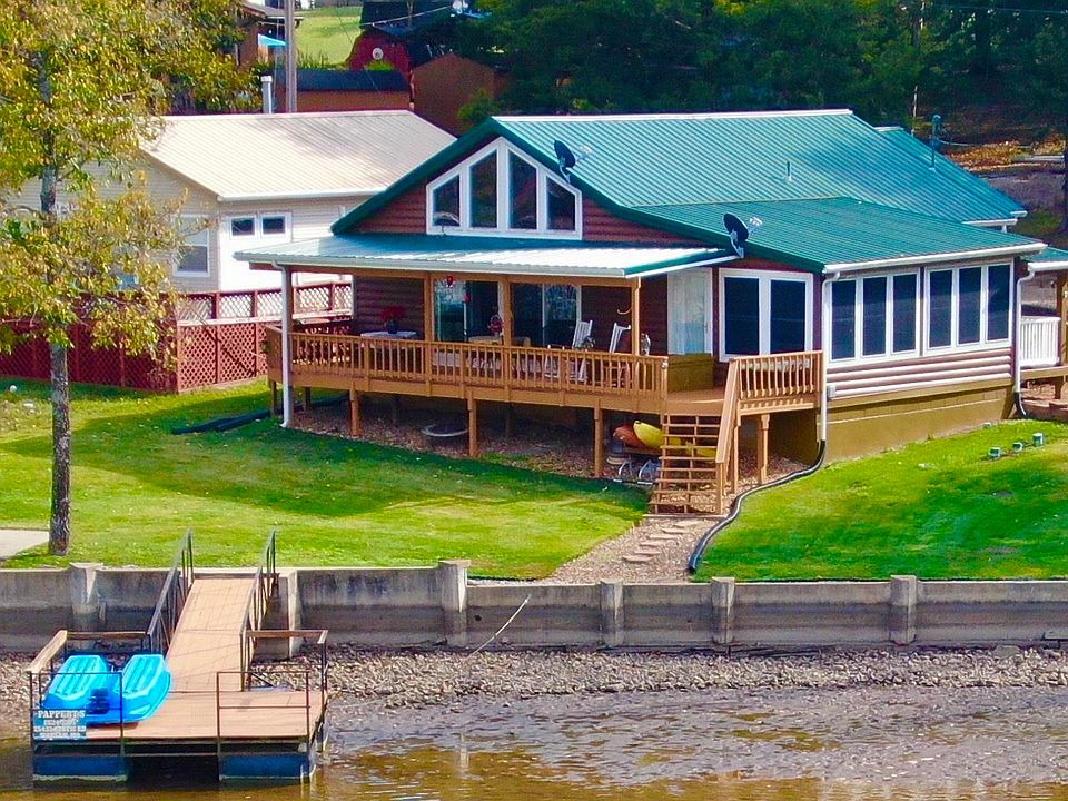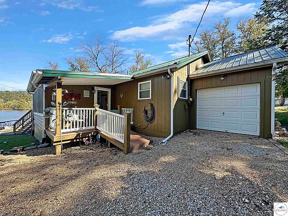 Waterfront Lake Home – Fully Furnished with Garage and Extra Lot with Storage Shed. This beautifully maintained, move-in ready waterfront home on Lake of the Ozarks is fully furnished and includes an attached one-car garage. Offering over 1,500 square feet of total space, the 2-bedroom, 1-bath layout provides both comfort and functionality in a peaceful lakefront setting. Additional sleeping accommodations include two sofa sleepers. Relax on the covered front porch or enjoy the expansive, full-length covered deck with lake views accessible from the living area, which features vaulted wood ceilings and sliding glass doors. The open-concept design seamlessly connects the living, dining, and kitchen areas, making it ideal for everyday living or entertaining. The kitchen includes stainless steel appliances and a custom coffee bar adjacent to the dining area. The bathroom features a walk-in shower, and the laundry room, located across the hall, includes built-in shelving and cabinets for added storage. Both bedrooms are carpeted and feature ceiling fans. This property comes with a kayak, a paddle boat, a Yamaha golf cart (stored in the garage), and an additional lot across the street that includes a storage shed—perfect for storing outdoor or recreational equipment. The shoreline offers over 90 feet of seawall, a private swim platform with benches (permitted through Ameren), and approximately 4–5 feet of water depth at full pool—suitable for flat-bottom or pontoon boats. Conveniently located near waterfront dining, marinas, and a variety of outdoor recreational activities such as boating, fishing, and exploring nature.