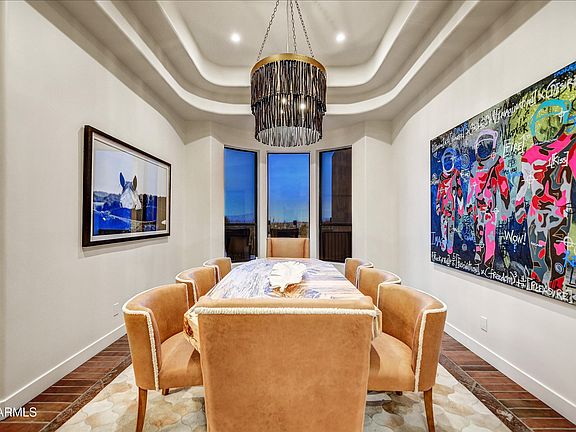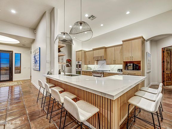 **New roof & 2 new HVAC systems. Please see upgrades list in docs tab for all details** A masterpiece of luxury and design, this stunning single level estate in the prestigious guard-gated Troon Village offers breathtaking views and an impeccable remodel with custom finishes throughout. The striking curb appeal is enhanced by a travertine-lined courtyard, a custom iron gate, and a grand entrance with sweeping views of Four Peaks. Step through the glass front door into a dramatic foyer with a round coffered ceiling, illuminated to perfection, seamlessly opening into the expansive living space. The living room exudes character and charm with a custom entertainment center, a floor-to-ceiling designer-tiled fireplace, and bold sliding glass doors that fully retract, creating a seamless transition to the resort-style backyard. The newly designed chef's kitchen is a showstopper featuring sleek light rift oak cabinetry, quartz countertops, top-of-the-line stainless appliances, triple ovens, a gas range, coffee & appliance garage, and a spacious breakfast bar with ample seating, and contemporary pendant lighting. A charming breakfast nook, formal dining area, and an additional living space off the great room provide versatility and flow. The luxurious primary suite is a private retreat, boasting new wood floors, a custom accent wall, a cozy fireplace, a seating area, a built-in desk, and direct access to the covered patio. The spa-inspired primary bath is pure indulgence, offering dual floating vanities, quartzite countertops, a designer soaking tub, a walk-in shower with multiple sprayers, custom bench seating, and sleek glass enclosure as well as dual closets designed by Classy Closets. Each guest suite is designed with sophistication, ensuring comfort and style with new wood floors. Two of the guest bedrooms are ensuite. The resort backyard is an entertainer's paradise, featuring a newly built heated pool, an expansive covered patio, a raised seating area with a striking custom outdoor fireplace. A state-of-the-art outdoor kitchen, complete with a built-in BBQ, refrigerator, granite countertops, pendant lighting, and generous bar seating, makes this the ultimate space for hosting and relaxation. This extraordinary estate, set in a prime Scottsdale location, offers the perfect blend of elegance, comfort, and breathtaking indoor-outdoor living.