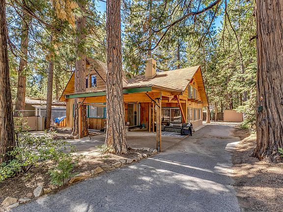 Discover the perfect blend of rustic charm and spacious comfort in this charming modified A-frame mountain home. Featuring a dramatic great room with open beam ceiling, rich natural wood paneling, expansive picture windows and large rock fireplace, this home exudes warmth and character from the moment you step inside. Ideal for entertaining, the open-concept layout includes a spacious dining and family room with a second rock fireplace and beamed ceiling, creating a cozy, inviting atmosphere for gatherings of any size. The centrally located kitchen is designed for function and flow, offering easy access to both living areas - perfect for hosting friends and family. The main-level primary bedroom offers convenience and privacy, while two oversized loft-style bedrooms upstairs provide multiple sleeping options or flexible space for work and play. A full bath on the main floor adds to the home's practicality. The level lot has ample parking - including space for an RV - and room for outdoor recreation. The detached two-car garage, currently used as a game room, has an adjoining guest quarters with bath and laundry room. Located on a snow plowed road. Selling partially furnished.