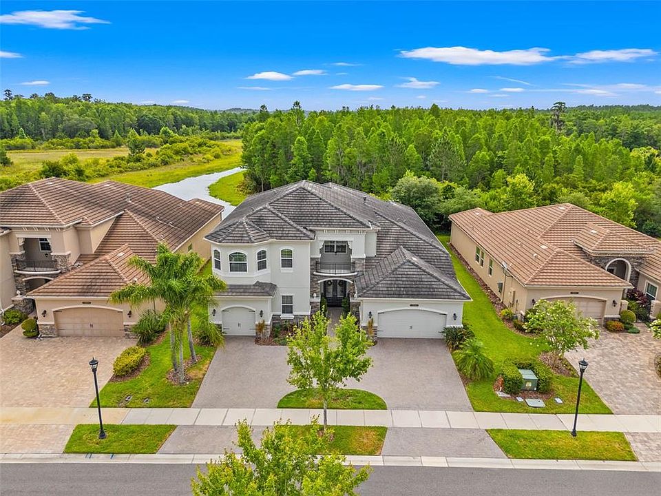 Your new home awaits your arrival in the exclusively gated maintenance-free community of The Ridge at Wiregrass. This beautiful home was built in 2017 & consists of a meticulously designed floor plan featuring a downstairs master, 2nd bedroom with an ensuite on the first floor, 2 additional bedrooms upstairs, a library or office downstairs, a dining room, and a media room. The offerings of this settlement do not end here, as you will enter on the circular paver driveway & experience the gorgeous landscaping in the front or pull into the spacious 3-car split garage complete with a 220-volt outlet. This fairy-tale-esque home boasts a Romeo & Juliet balcony in the front and continues to impress with a grand entrance with 21 ft ceilings. With natural light shining through the bounties of windows into the open floor plan, a sense of vibrance & openness is present. The family room, located in the center of the home, includes a gas fireplace with sliders leading out to the salt water/heated pool. Embrace Florida’s vivid greens with a stunning view of nature by the pond from the screened-in pool area. While enjoying these sights from the private comfort of your home, you may have to share them with the ducks that tend to come around the back. Back inside the home lies the casual dining-off the kitchen overlooking this view & a formal dining room connected to the other side. The stainless-steel double wall ovens, natural gas cooktop and quartz countertop invite aspiring chefs to an ideal workplace. An abundance of cabinets allows for prime storage & an island provides additional countertop space for any cooking needs. Moving into the primary bedroom, you will encounter spectacular features such as custom-built walk-in closets & coffered ceilings, with windows offering a view of the idyllic scenery. The primary bathroom is spacious with two separate sinks, a vanity, a soaking tub, a bidet, and a recently updated shower with gorgeous marble composing a bench & wall niche inside. Head upstairs using the semi-spiraled staircase leading to an overlook of the downstairs. This stately touch gives a sense of openness & invitation to the home, which continues as you enter the two expansive bedrooms upstairs. The first bedroom contains an ensuite bath, while the other holds a commodious walk-in closet and a bathroom shared with the bonus/media room. As the home itself offers everything you need & more, do not underestimate the opportunities lying outside of these walls. The Ridge at Wiregrass provides a multitude of amenities such as the clubhouse, a game room, and a fully equipped fitness center. This advanced community continues to impress with a covered patio that overlooks the resort style pool. To live like you are on vacation, embrace the beach entry to the pool area containing a water slide, fire pit, wet play activity center, and lap pool. The four lighted clay tennis courts, full basketball court, and beach volleyball court allow for sports play without leaving the neighborhood and the open play field, shaded tot lot, and party pavilion present the perfect scene for social gatherings and fun. Upon leaving The Ridge at Wiregrass Ranch, you will be surrounded by plenty of shopping, restaurants, and other necessities, with places such as Wiregrass Mall, AdventHealth Center Ice, Hospitals, I75 and I275 highways, and several A-rated schools nearby. Enjoy the community of your dreams and return to the home of your dreams when the day is done!