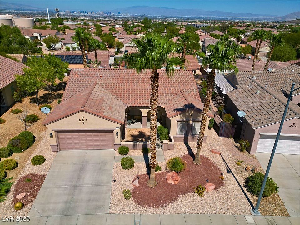 Immaculate Jefferson model in the desirable Mountainview Village of Sun City Anthem. Charming curb appeal with private gated courtyard welcomes you to this open-concept, split-bedroom design. Bright eat-in kitchen with breakfast nook flows into the spacious great room, with adjacent den perfect for office, dining, or sitting area. Freshly painted in neutral tones with updated lighting, dimmers, and elegant tile flooring throughout. Expansive covered patio on elevated lot offers stunning mountain views and a peek-a-boo strip view. Recent upgrades include newer HVAC, solar window screens, new irrigation drip system, and industrial garage cabinetry. Mature, professionally maintained landscaping completes the setting. Sun City Anthem’s premier 55+ community features world-class recreation and fitness centers, social clubs, and endless activities. Ideally located near shopping, dining, and entertainment—this home is truly move-in ready!