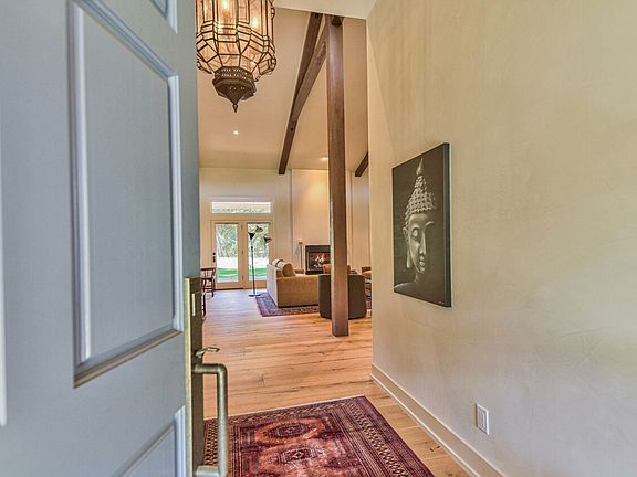 The primary suite is a sanctuary, offering a generous walk-in closet, elegant wood floors, ample built-in cabinetry, and a spa-like bathroom with exquisite finishes. Additional highlights of this home include custom plaster finishes, hardwood plank floors throughout, an expansive patio complete with a serene water fountain, air conditioning, plentiful storage, and a two-car garage.