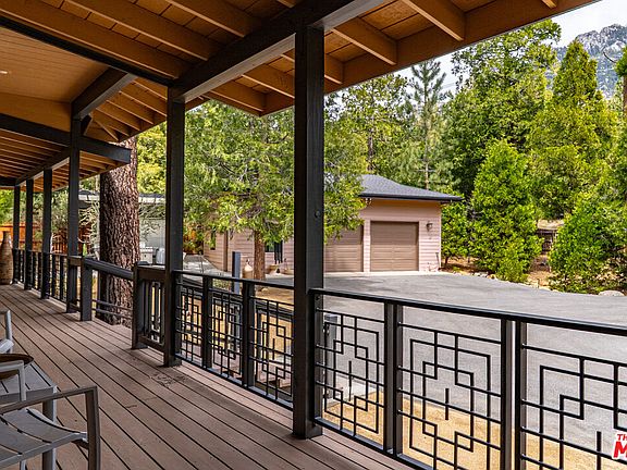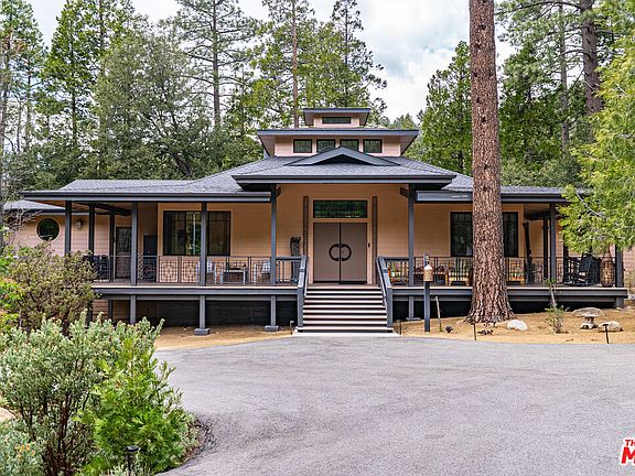 Nestled within the coveted enclave of Fern Valley, this bespoke contemporary lodge offers an unparalleled fusion of modern design and natural splendor. Set on an expansive acre adorned with pines, firs, manzanita, cedar, and 2 types of oak, the residence provides sweeping forest vistas to Strawberry Creek and the majestic Tahquitz Rock. Beyond its fully gated and fenced perimeter lies a sanctuary of sophistication. The main residence features three meticulously designed bedrooms and three bathrooms, complemented by a fourth bathroom in the detached multi-vehicle garage and workshop - a harmonious blend of luxury and practicality. Encircling the home, a wrap-around porch invites moments of serenity, framing the ever-changing tapestry of mountain views. The grand foyer, illuminated by clerestory windows, leads into a voluminous living room where vaulted beamed ceilings, skylights, and a dual-sided wood-burning fireplace converge to create an ambiance of warmth and grandeur. Bamboo flooring and antique artisan-crafted wooden built-ins underscore the home's commitment to natural elegance. At the heart of the residence, the gourmet kitchen offers exquisite stone countertops and a butcher block island with an integrated sink, catering to culinary enthusiasts. A spacious walk-in pantry and adjacent laundry room offer ample storage, ensuring both form and function. The owner's suite serves as a private retreat, featuring a secluded deck, generous dressing room and closet space, and a spa-inspired bathroom complete with a picture window and a Japanese soaking tub, offering a tranquil escape in nature. Guest suites are thoughtfully appointed with large corner windows, walk-in closets, and en-suite bathrooms, ensuring comfort and privacy for visitors. An original Jim Marsh AIA and constructed by renowned builder Terry Griner in 2005 with meticulous attention to detail, this residence has long been celebrated as one of Idyllwild's premier properties and is ideal for full-time living or high-end vacation rental potential.
