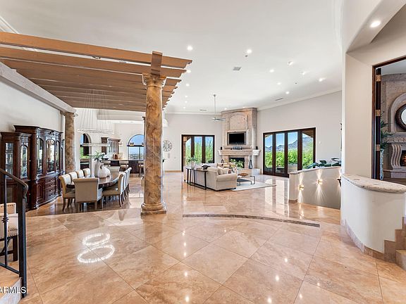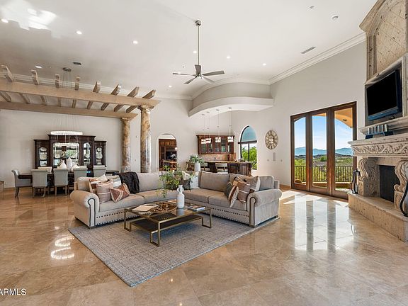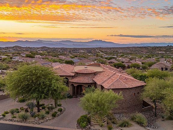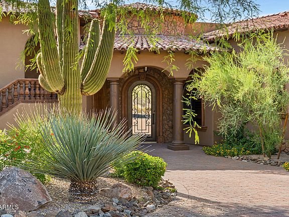 Step into a Tuscan dream where classic lines seamlessly blend with modern luxury. Nestled in the serene enclave of Troon Village, this 7,112 sq ft masterpiece offers an irresistible sanctuary, enveloped by nature's beauty and tranquility. The heart of this home is its expansive kitchen, featuring a Wolf range and Sub-Zero fridge freezer, complemented by a separate breakfast area perfect for morning gatherings, opening onto a spacious great room with sweeping views across the valley. Throughout the home, cantera stone fireplaces add warmth and elegance to the living spaces.The exquisite primary bedroom suite is a haven of tranquility, featuring a large closet with full laundry facilities and a quiet sitting area for peaceful moments. Each of the three guest bedrooms boasts an ensuite.. bathroom, while a charming den provides the perfect retreat for work or relaxation. Imagine unwinding by your negative edge pool, with extraordinary mountain vistas and sunsets painting the sky and mountains in mesmerizing hues of purple and gold. Inside, elegance abounds with a uniquely designed formal dining room, a wine cellar for your finest collections, and tailored spaces for a gym and theater. Securely set within a patrolled, guard-gated enclave, this home isn't just a residence; it's a lifestyle of unparalleled grace and splendor, offering a peaceful escape from the bustle of everyday life.