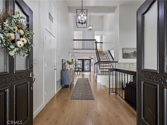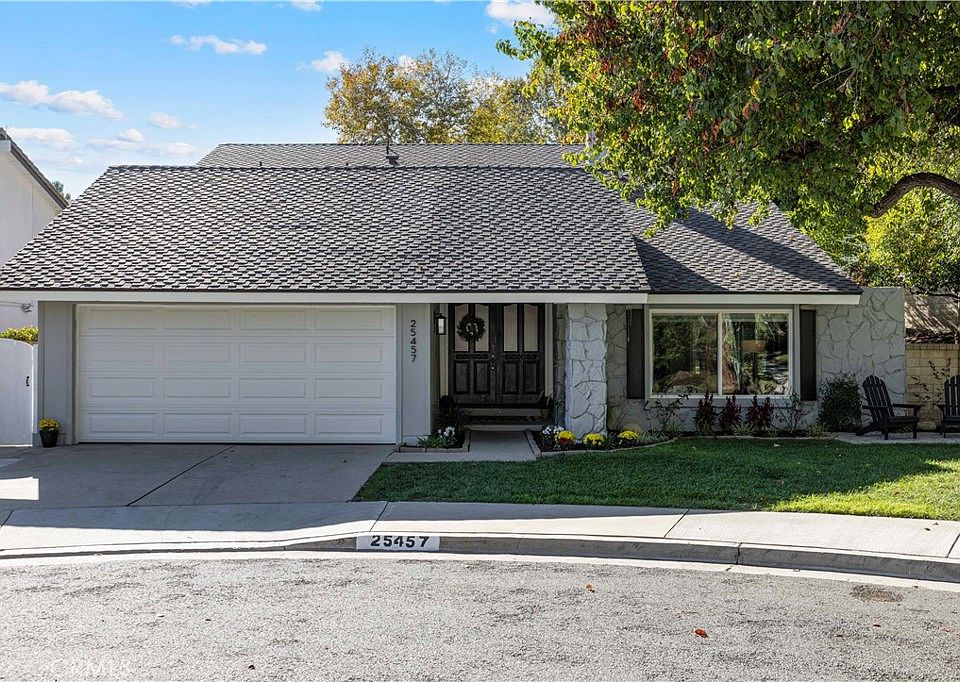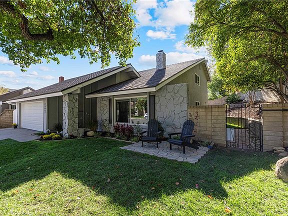 Valencia Hills at its BEST! You'll love the Mid-Century Modern flair that oozes from this fantastic 2327 SqFt, 5+3+Den Home. Lush Curb Appeal and a Perfect Cul-de-Sac location at the foot of the extensive Valencia Hills Paseo System. Every Community Amenity is just a Paseo stroll away. Remodeled from top to bottom just a few years ago! The Double-Door Entry opens to the drama of the Vaulted Beam Ceilings, Step-Down Living Room with access to the wrap around yard, and the first of two Fireplaces in addition to the adjacent Formal Dining Room. The spacious Kitchen boasts Quartz Counter Tops, Decorator Backsplash, and Stainless Appliances. The Great Room includes an Open Dining Space and Family Room with a Tiled Fireplace and French Doors to the rear yard. A Bedroom and Full Bathroom complete the lower level. Upstairs, the Primary Suite includes a Contemporary Bathroom. Three additional Bedrooms and a roomy secondary Bathroom complete the upper level. Everything has been redone on this one including a New Roof and Expansive Patio Cover, Exterior Paint, Kitchen, and Baths in 2022 AND New Plumbing, 200 Amp Electrical Panel, Landscaping, and Irrigation in 2025. This is truly a Turnkey Property that's ready to go! Low HOA, NO Mello Roos, Community Pool, Spa, Pickleball, Tennis, Basketball, Greenbelts, Recreation Center and more. One of the most sought after neighborhoods close to Downtown Newhall and loads of other Amenities, Commuter Routes, and all that The Santa Clarita Valley has to offer!