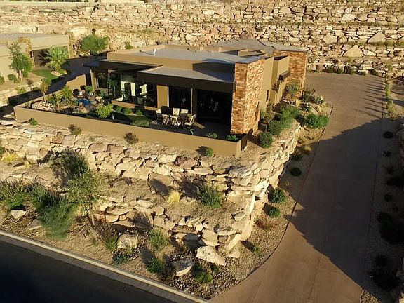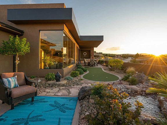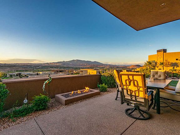 LIST AGENT JULIE MILLETT 435-705-3298 Beautiful home featuring unobstructed views of Pine Valley & City Lights. Secluded Courtyard, 12 & 10 ft Ceilings, large view windows, hardwood doors & trim, large sliding glass doors open to sizable patio w/built in BBQ, gas fire pit & putting green. Energy efficient heating & cooling. Huge Flex Room or 4th bedroom. Oversized Garages.