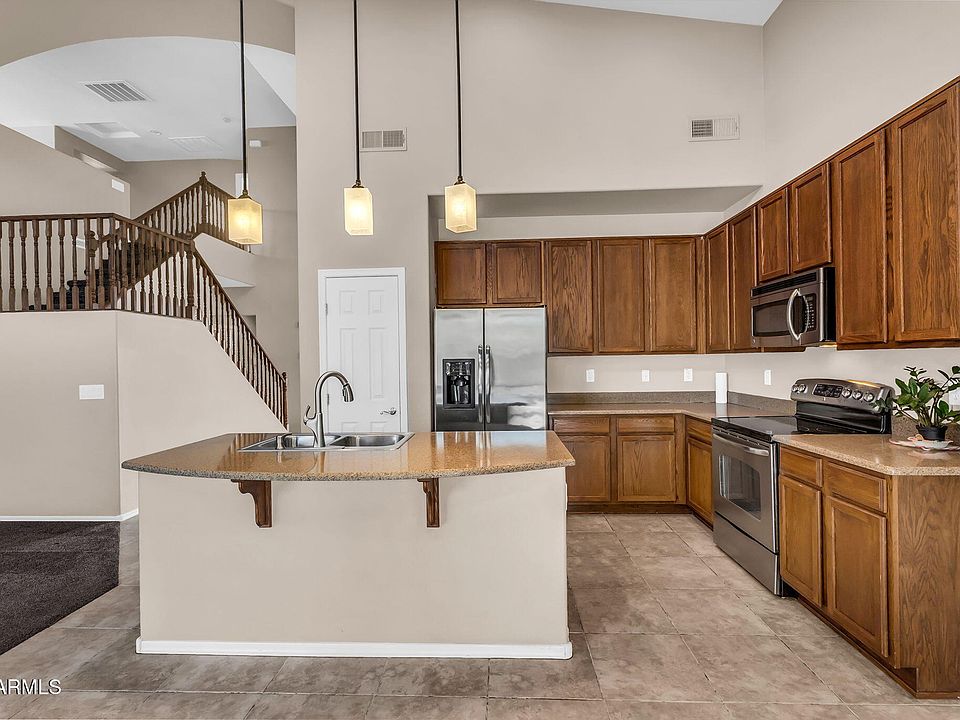 Welcome to this beautifully designed Casa Grande home, perfectly situated on a corner lot adjacent to a greenbelt on a quiet, low-traffic street with no front-driveway homes across the way. Inside, you'll find a spacious open floor plan with large rooms, soaring ceilings, and a cozy fireplace in the living area. The kitchen features granite countertops, a central island with breakfast bar, stainless steel appliances, and stylish pendant lighting. The primary suite includes dual sinks, a soaking tub, step-in shower, and walk-in closet. A versatile upstairs loft and bedrooms that enjoy stunning mountain views. Outdoors, unwind or entertain under the covered patio, wood pergola, and paver patio. The Community offers an amazing pool with water slide and kids play area. A must see!