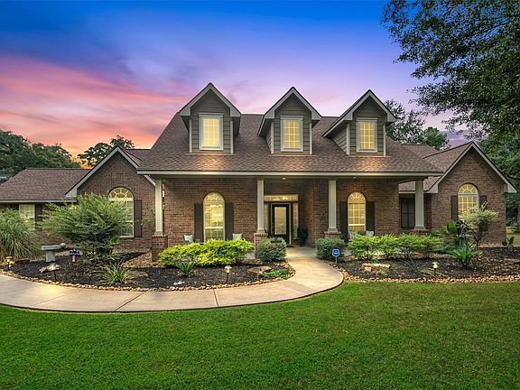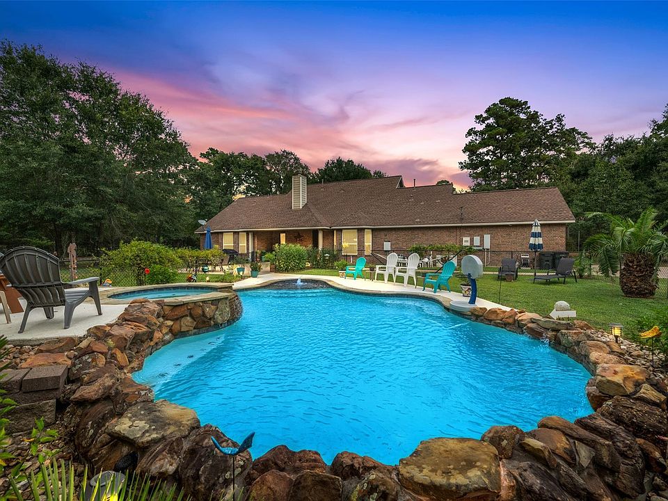 Beautiful brick home accented by dormer windows, shutters, & a leaded glass entry welcomes you with professional twilight curb appeal. Inside, the foyer opens to a versatile office with French doors & crown molding, while the main living area offers 11’ ceilings, recessed lighting, and a fireplace with pre-wired surround sound. The gourmet kitchen features granite counters, stacked cabinets, stainless appliances, electric cooktop, and a breakfast nook with bay window. The spacious primary suite includes a vaulted ceiling, bay window sitting area, and spa-like bath with dual vanities, soaking tub, and walk-in shower. Secondary bedrooms boast tall ceilings and arched windows. Outdoor living shines with a resort-style pool, raised spa, waterfall, and freeze protection, plus rock & porch speakers. Set on cleared acreage with pecan and pear trees, this property also offers a Guardian generator, utility building, & 30x50 shop with 220 power—all just minutes from Hwy 290 and Waller amenities.