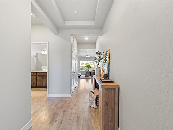 Welcome Home! This beautifully maintained, Tanninen-built 3-bedroom, 2-bath, 1687 sq ft home perfectly blends modern design with everyday comfort. Inside, you’ll find quartz countertops, Huntwood cabinetry, LVP and tile flooring, and a cozy gas fireplace with tile surround and wood mantle. The primary suite offers a walk-in tile shower and a spacious closet, while the laundry room is thoughtfully designed with a folding counter and built-in space for baskets. A custom Murphy bed adds versatility to one of the bedrooms—ideal for guests, hobbies, or a home office. Step outside to your budding oasis featuring a covered patio with extended concrete, vibrant Japanese maples, redbuds, and willows. The gated side yard offers a flex space or dog run—fenced, graveled, and perfectly placed for relaxing in the evening shade. Enjoy your evenings under the covered patio with gas BBQ hookup and LED lighting, or take advantage of the unbeatable location—just moments from the Country Mercantile, scenic walking paths, highway access, and nearby wineries with sweeping wine country views!