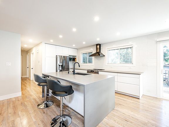 Updated kitchenWhite cabinetryCeiling height tile backsplashModern main bathroomHeated floorsDual sinksDurable laminate flooring