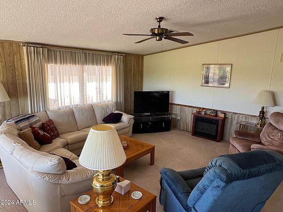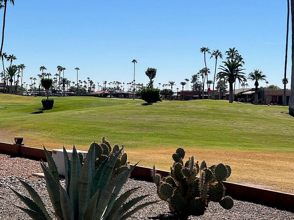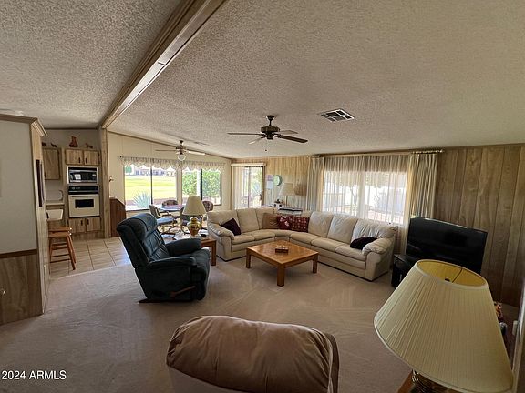 Beautiful 1986 Palm Harbor manufactured home located on the 10th green and 11th tee box of the Apache Wells 18-hole golf course. Boasts a very open floor plan with vaulted ceilings. The kitchen and eating area flow into the living room. View of the golf course from the kitchen sink.