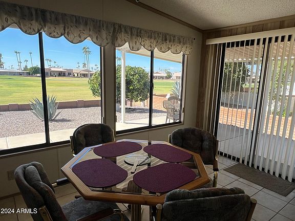 Formal dining room with bay windows. The home has dual pane windows with nice window coverings. The laundry room has an abundance of cabinets with a built in desk. There is a golf cart garage with an electric door opener, as well as a separate storage area/work shop. Just a short distance to the restaurant and all the wonderful amenities Apache Wells 55+ community has to offer.