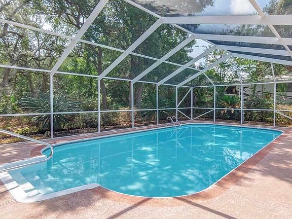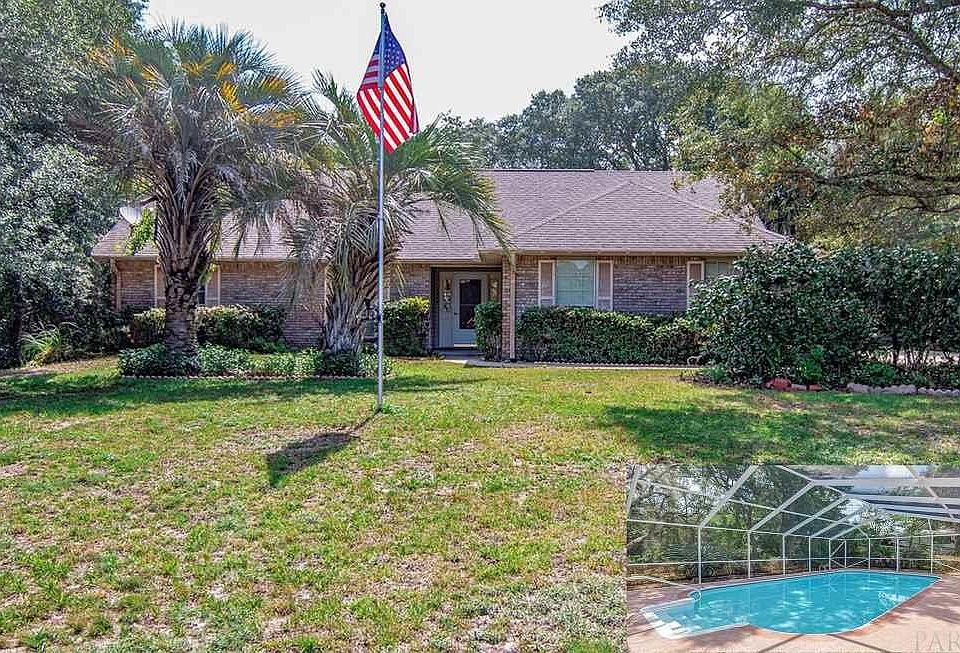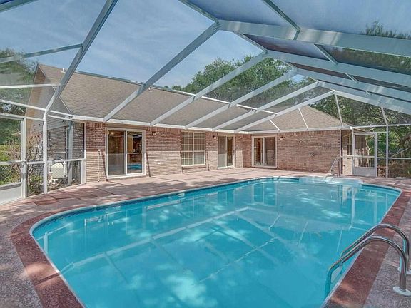 Pool home in Hidden Creek on beautiful wooded lot. 4 bedroom 2 bath all brick has screened enclosed pool. Incredible opportunity! Great room has high cathedral ceiling and entrance to pool deck. Kitchen with breakfast room is tiled with appliances including refrigerator. The master bedroom has an area of its own with master bath and walk in closet. The three guest bedrooms share a bath and one of these has been used as an office/study. Priced to reflect the upgrades that will be required, this is an excellent opportunity for buyer who is looking for a prime location and willing to do some improvements. The house has been cleaned and pressure washed and is ready for a timely sale. Ownership includes membership to Holley by the Sea's multi-million dollar 45 acre recreational center with 8 clay tennis courts, 3 swimming pools, full gym, aerobics, summer camp, lighted basketball courts, sauna & steam room, playground game room, community house on Santa Rosa Sound with playground, dock, access to the East Bay boat launch and many community events. Only minutes to the pristine white sugar sand beaches and emerald water of the Gulf of Mexico.