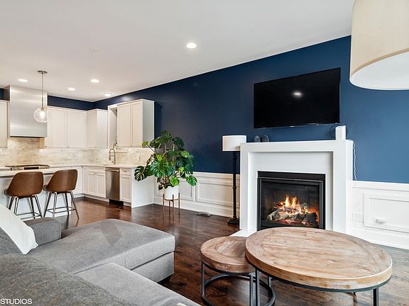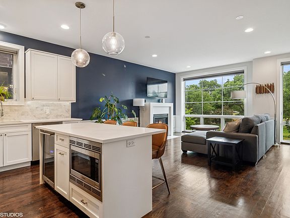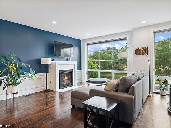 Beautiful newer build 2 bed, 2 bath located in the coveted Coonley School district. Seller completed a ton of upgrades including adding hardwood to both bedrooms, and lighting throughout the kitchen and living space. This unit features the finest finishes with an all white kitchen with under cabinet lighting, quartz counter tops, marble backsplash, Bosch SS appliances, custom range hood, and wine fridge. Living room has a gas fireplace, floor to ceiling windows with south views, dark hardwood floors and wainscoting. The 1/2 level down features the 2nd bedroom/bath in addition to the primary w/ walk in closet, large m bath w/ whirlpool, oversized shower and double sink vanity. Private balcony of of the primary bedroom. One garage parking space included. Large common roof top deck over garage with grill, tables and plenty of seating for entertaining. Steps to the newly extended river walk and across the street from Revere Park.