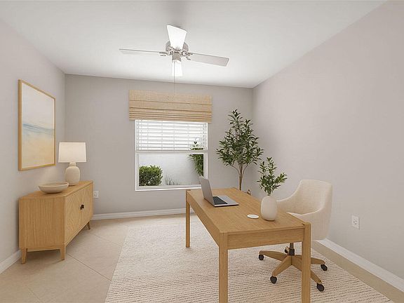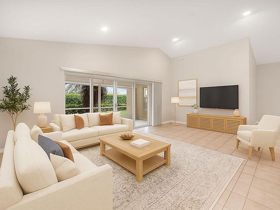 Tucked within the quiet, tropical surroundings of Fairway Dunes, this beautifully maintained single-family home offers 2 bedrooms plus a den, 2 bathrooms, and a 2-car garage—perfectly blending privacy, comfort, and a convenient Bonita Springs location. Enjoy serene garden views from the screened lanai, complete with tile flooring, recessed lighting, and covered outdoor living. Storm protection includes both electric and manual shutters, and lush tropical landscaping enhances the private setting. Inside, the open layout features tile flooring throughout the main living areas, crown molding, and recessed lighting. A glass slider in the living room opens to the lanai, filling the home with natural light. The kitchen offers white cabinetry, a skylight, pass-through window over the sink, and a bar-height counter for casual seating. Frigidaire stainless steel appliances include a range and refrigerator with icemaker, while an adjacent dining area completes the space. The spacious owner's suite overlooks the garden and includes private lanai access, a walk-in closet with built-ins, and an en-suite bath with dual white vanities, a full-width mirror, and a glass-enclosed walk-in shower. The guest bedroom enjoys peaceful lake views and is conveniently located next to a full bath with a tub/shower combo. A versatile den with pocket doors and ceiling fan offers space for a home office or study. Additional features include a laundry room with washer/dryer hookups, a utility sink, overhead cabinetry, epoxy garage flooring, and updated high-top lighting. The electrical panel (Square D) was replaced two years ago, and the AC, water heater, and roof were all updated around 2019-2020. The home is located in an X flood zone and there are no current assessments. Fairway Dunes is a peaceful, centrally located community featuring a pool with bathrooms, clubhouse, tennis and pickleball courts, a BBQ area, and scenic paths that wind around the lake. Ideally situated just minutes from Coconut Point, the Promenade, downtown Bonita Springs, RSW Airport, I-75, FGCU, golf courses, parks, boat ramps, and white sand beaches of Southwest Florida, this home offers a perfect balance of relaxed living and everyday convenience.