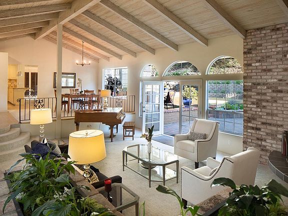This sprawling single level home is nestled within a quiet nook of Carmel and set on a sun drenched lot with enormous backyard patio, multi-tiered waterfall, storybook gazebo and legal, full sized 1 bedroom, 1 bath guest house with private entrance! Inside, a spacious great room, living room, dining room and master suite featuring sliding doors for easy indoor/outdoor living.