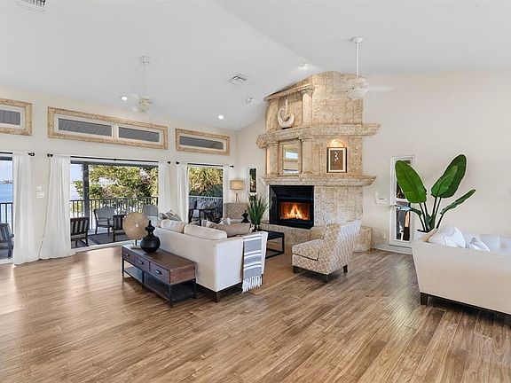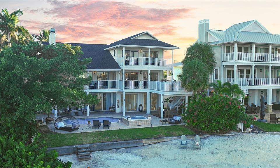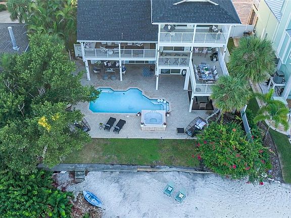 BEACH HOUSE ON THE BAY | PRIVATE BEACH | WALK TO THE GULF  This luxury-style Key West–inspired Beach House on the Bay offers everything you could dream of in a Florida waterfront retreat—six balconies and patios for entertaining, panoramic water views from every room, and over 4,000 square feet of living space (5,750+ total gross area). Splash in your heated pool and spa featuring a custom dolphin inlay and cascading fountain, grill on the patio, or launch a kayak from your private dock. Surrounded by lush tropical landscaping, the property feels like a private resort. Especially rare for St. Pete Beach, this home offers both boat access and a private sandy beach—perfect for volleyball, s’mores by the fire, or building sandcastles at sunset.  Welcome to Beach on the Bay—a rare waterfront residence offering the best of both worlds: your own private beach on Boca Ciega Bay with a boat dock and just a three-minute walk to the white sands of the Gulf. Architecturally unique among a row of waterfront mansions, this elevated five-bedroom, four-bath home combines privacy, smart technology, and an expansive coastal lifestyle. Designed for flexible living, it features a full kitchen plus a kitchenette, two laundry rooms, and multiple gathering areas ideal for entertaining, multi-generational living, or a high-income vacation rental.  The lower-level living area includes two bedrooms, a full bath, kitchenette, casual living and dining spaces, a second laundry room, and ample storage. Tile floors thro0ughout, quartz countertops, and durable, water-resistant wainscot finishes create a coastal feel throughout this inviting space, which opens to more than 500 square feet of covered paver patio that seamlessly transitions to the pool, hot tub, and private beach. A bonus room and split three-car garage complete this level.  The main level showcases soaring 14-foot ceilings, a dramatic triple-stacked fireplace, and a custom free-floating staircase. Expansive living spaces open through floor-to-ceiling glass to a 500-square-foot waterfront balcony. The chef’s kitchen features rich dark granite surfaces, stainless steel appliances, a center island, dual breakfast bars with seating for eight, and a dining area overlooking the pool and bay.  Upstairs, the primary suite is a true retreat with a private 180-square-foot balcony offering breathtaking views of the pool, beach, and Boca Ciega Bay. A distinctive porthole window captures the sunrise over downtown St. Pete, adding a touch of nautical charm. The spa-style ensuite bath features dual vanities, granite surfaces, refined tilework, and a spacious walk-in shower. Another guest bedroom, full bathroom, and laundry room complete this floor.  Entertaining is effortless with multiple covered patios, an outdoor granite-topped bar, and generous lounge areas surrounding the heated pool and spa—all framed by vibrant tropical foliage, swaying palms, and brilliant sunsets. Smart home features enhance comfort and security throughout.  Recent updates include a 2025 roof, and the property comes fully furnished with designer décor—turnkey and ready to enjoy. With proven rental income exceeding $12,000 per month, this residence offers a rare combination of luxury, privacy, and coastal charm. Ideally located near the Don César, top-rated beach restaurants, and everything St. Pete Beach has to offer, it represents one of the area’s most remarkable waterfront opportunities.