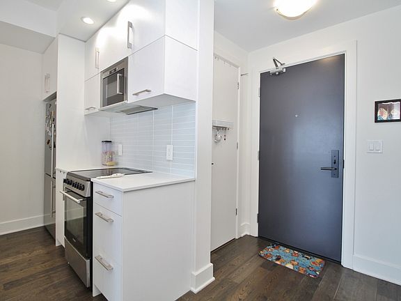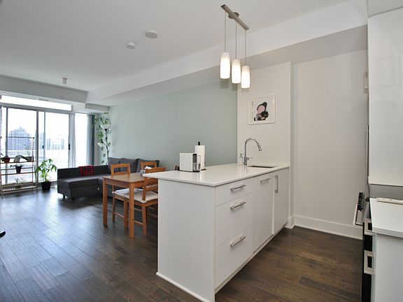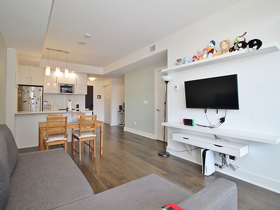 Reside in this elegant luxury newly built high-rise (Bowery Tower) condo on Bay Street. Modern high-quality brown hardwood floors throughout the condo. Upgraded kitchen with white Quartz countertop, breakfast bar island, tile backsplash and stainless steel appliances (with dishwasher). Bright living room with floor-to-ceiling windows to let natural sunlight with access to a balcony with a beautiful view from the 12th floor. Modern bathroom with beautiful floor tiles and shower/tub combination with cheater door to bedroom. The large bedroom features a big closet and large windows. Set up your office to work from home with this beautiful Den/Office located right across the kitchen. The condo is equipped with central heating and AC.