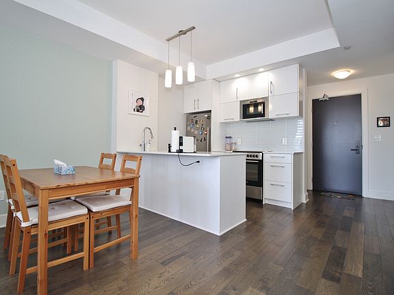 Upgraded kitchenWhite quartz countertopBreakfast bar islandTile backsplashStainless steel appliancesFloor-to-ceiling windowsAccess to a balcony