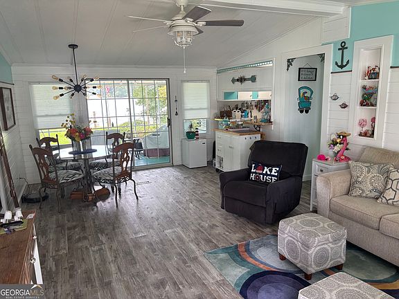 Fantastic big water view. Perfect area of the lake. Great plan and layout - no wasted spaces here. Ample sleeping capacity and oversized screened porch for making those memories with family and best of friends. Loved and enjoyed for years. Impeccable condition. Enjoy this great Georgia lake weather for nearly all the months of the year. Level lot and storage buildings for extra space. Best deal on beautiful Sinclair. Enjoy the best fireworks show around from your own dock,yard and porch! Crooked creek fireworks!