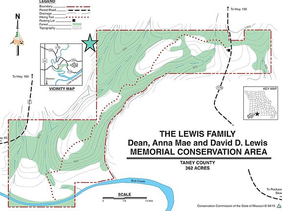 Ideal Small Acreage in Branson School District (and within minutes of town) backs up to 362 acres of Conservation Land! Talk about the best of both worlds! Shared well 1/3 interest included & electric and Optimum cable for TV & high speed internet are at the road, which is, by the way, paved all the way. Hunt from your back yard! Clearing is done so you can see and walk this gorgeous level lot. Great for one-level home OR SE corner of the lot slopes perfect for a walkout basement floor plan. Could have good view to the South East if house is situated right. Reasonable restrictions including 1500 sq ft min on main level, 4 pets and horses ok. See photos and attachments for map and topo of the adjacent conservation land which has trails and goes all the way to Bull Creek! Bow hunting, tree stands allowed, see attached for details. https://mdc.mo.gov/discover-nature/places/lewis-family-dean-anna-mae-david-d-lewis-memorial-conservation-area