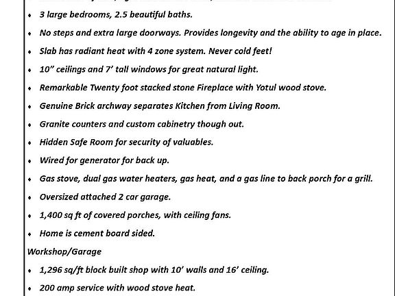 This incredible ICF constructed home features 3BR & 2.5BA and approx 2570 sq ft of living space. There is over 1400sq/ft of covered front and back porches with fans for premium outdoor living. There are 10' ceilings and 7' tall windows affording great natural light. The slab foundation has radiant floor heat 4 zone system including the attached garage. The amazing Yotul stove in the living room has a beautiful, stacked stone wall behind it. The brick arch separating the Kitchen and living room is real hand laid brick. Granite counters throughout this home and custom-made cabinetry. The stove, water heaters and heat unit are gas, and there is a hook up for gas grill on back porch. 400 amp service provides 200 amps to each structure and home is wired for a generator for emergency power. The exterior is cement board, There is a water collection system and a self watering garden system. There are fruit trees, grapes and berries. The pantry is huge for those who home can and buy in bulk. You will appreciate the peace and quiet this home affords you. The house is over 1000 feet from the road, with a custom built log entry. There is a large pond with a dock! So many reasons to come and view this home. Buyer to verify all info please.