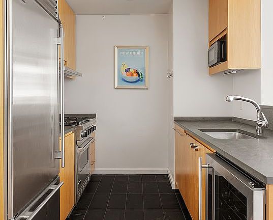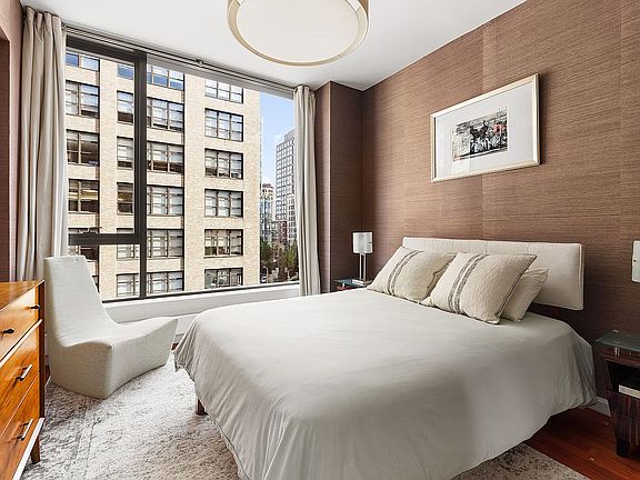 Perched above the city on the sixth floor, an Eastern wall of floor-to-ceiling windows in the living room and bedroom overlooks beautifully landscaped Freeman Plaza West. An entry hall leads down past the kitchen into the living room. The kitchen is well-scaled to allow for entertaining with a Sub-Zero refrigerator, Bosch dishwasher, Viking stainless steel range, custom Tanzanian Anigre wood cabinetry and gray Slate countertops, wine fridge, and Italian green glass backsplashes. The master bathrooms are spa-inspired with warm-toned Pietra Bedonia marble floors and surrounds, wood cabinetry, and a deep soaking tub by Kohler. The generously scaled bedroom easily accommodates a king-sized bed with room to spare and features excellent closet space. Central Air-conditioning, a vented washer/dryer, and gleaming hardwood floors throughout make this a quality lifestyle.