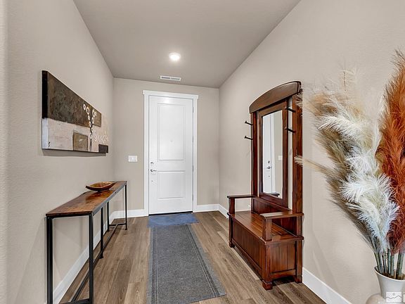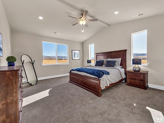 Welcome to your piece of the quintessential Northern Nevada experience - expansive spaciousness and the freedom to use it as you choose. Endless skies over a picturesque valley culminate at this new build on five acres., The rolling, snow-dusted hills envelop you as you ride atop elegant pavers through the parking and driveway areas. Minimal CC&Rs and absolutely no HOA means that your plot is yours to play with and play on, be it with large-toy storage, self-sustained gardening, or treehouses and pump tracks aplenty. Bask in the sunshine of a Nevada day while the dogs run and the kids play, out of sight but within the safety and solitude of your acreage. Wander your property with your morning coffee, stretching your legs and surveying your swathe. Stunning two-tone stucco and upgraded garage doors start the elegance. It continues inside with eye-pleasing contemporary features such as striking eight-foot raised panel doors throughout, five-inch baseboards, and high-end flooring. Breathe in and appreciate the breadth of the high ceilings and mountain views in the great room. Snuggle up and cozy in with a family movie night or time in front of a warm fire. The modern style of light-colored, square-edged granite countertops balances the timeless wooden cabinets. The breakfast bar island, walk-in pantry, upgraded cabinets, and breakfast nook give all the space and storage needed to entertain a group or maintain daily life. The owner's suite features a walk-in shower and spa-like bath, where attention to detail continues. Separated double sinks offer more of the expanse this home embodies. At the same time, the soaking tub beckons you to slow down and relax. When the day calls for action, the walk-in shower and walk-in closet move you along with ease. Get the charming rural experience with an included deep well (supported by whole-home water filtration) and septic, as well as shared road maintenance by property owners. Complement that with the ease and conveniences of urban living just down the road, giving you the best of both worlds. Step back to when we all had room to breathe. The American dream of white picket fences has shifted to wide-open spaces, and Palomino Valley Estates delivers. Furniture staging and photos represent a model home and may be subject to change.