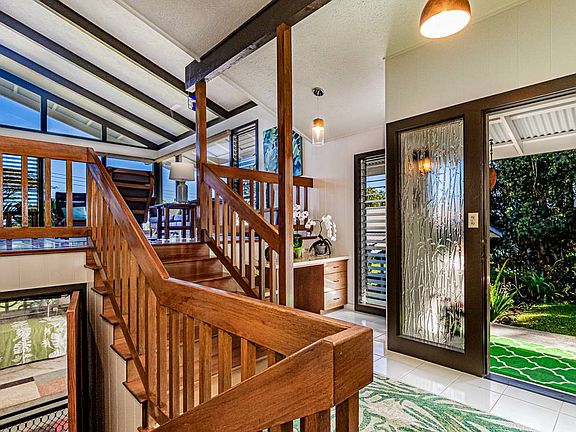 This spacious split level home is wonderfully designed to take full advantage of its location. The main living/dining/kitchen area has open beam ceilings & large floor to ceiling & clerestory windows to take in the spectacular views. The many custom features include built-in cabinets & shelves, Ohi'a stairs & solid surface countertops throughout the house. The home has 3 bedrooms plus an office/den/family room, 2.5 baths with 1643 sq ft of interior living area, 920 sq ft of partially enclosed & covered carport areas & 120 sq ft covered lanai. The large bonus room could be used for many purposes; it has custom built-in storage cabinets & a sliding door that opens onto a covered lanai & fully fenced garden area; safe and secure for dogs and/or children! The primary bedroom looks out onto the colorful gardens; has a large cedar lined closet; a newly remodeled spa-like bathroom with double sinks, quartz countertop and a custom tiled tub & shower. Two additional nice sized bedrooms, plus main bath with tub/shower combo are all off a wide hallway with ample closets.