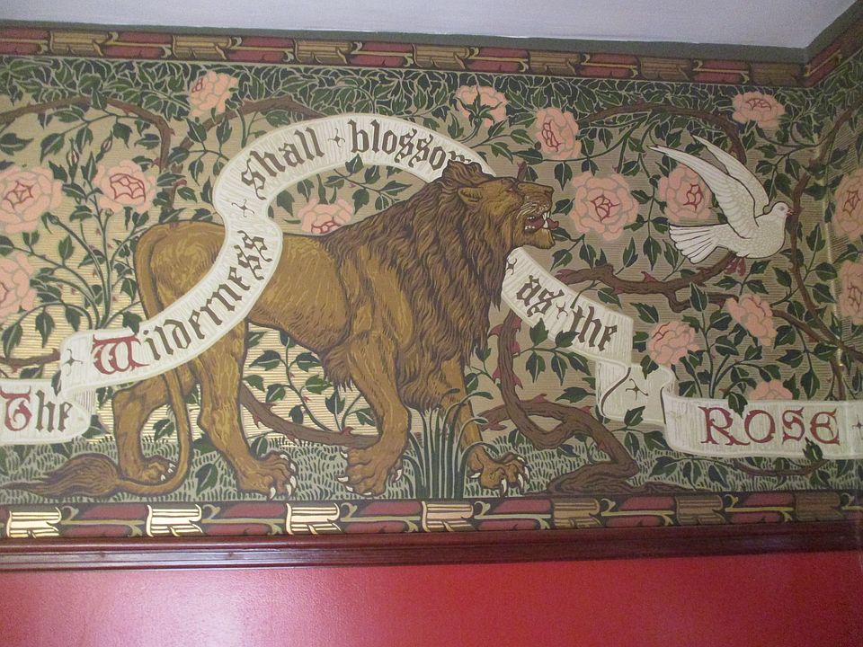 The bedroom is also custom painted, a large stained glass window, hand[ainted wall frieze, original built-in cabinet and dresser, original restired hardwood floors, and period chandelier and sconce. It also has custom shutters and wood mini blind window coverings