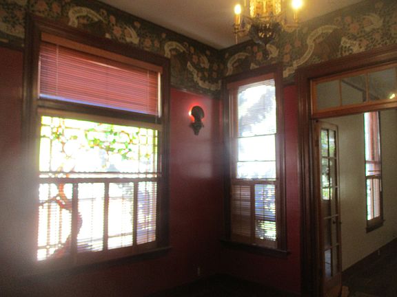 The bedroom is also custom painted, a large stained glass window, original built-in cabinet, original hardwood floors, and period chandelier.