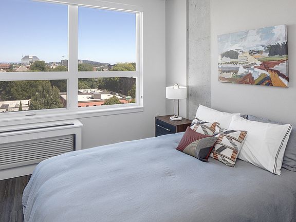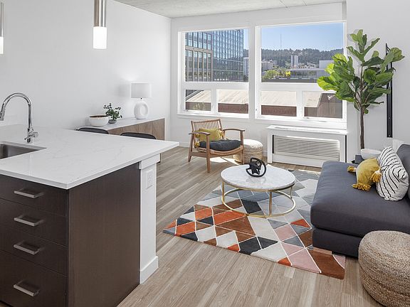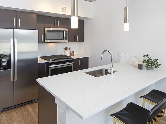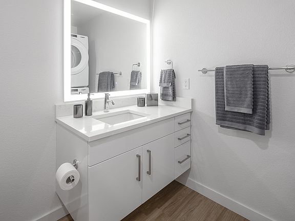 Airy open layouts, oversized windows, light filled spaces, an industrial vibe, and a view. It's all designed to feel as good as it looks. Modern kitchen with quartz countertops, stainless steel appliances, designer fixtures and large under-mount stainless steel sinks. Primary bathrooms equipped with rainfall showerheads and illuminated vanity mirrors. Bike storage, temperature control, and front-load washers and dryers. The must-haves, the nice-to-haves, the dream amenitiesthey're all included to help you live better.